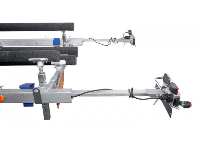 ● Съёмные выдвижные кронштейны с задними габаритными фонарями, исключают погружение светотехники воду и обеспечивают её сохранность. Для соблюдения требований ПДД, при перевозке судна выступающего за габариты прицепа, задние фонари могут быть выдвинуты на 1 метр. Жгут электропроводки убран в защитный гофрированный кожух. Штекер 7-pin.