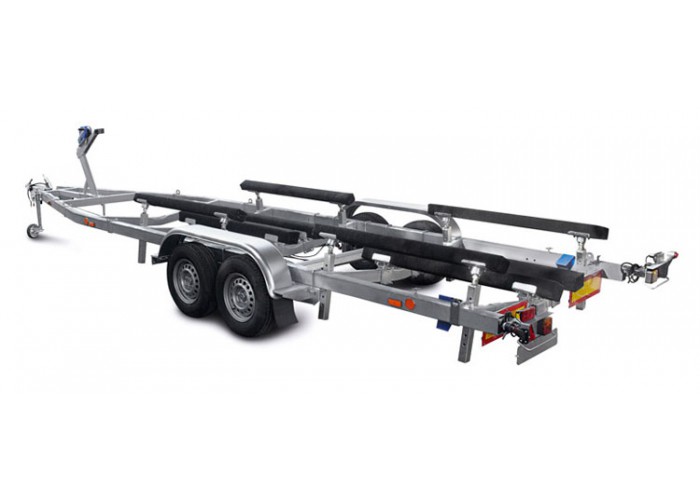● Двухуровневые передвижные ложементы могут быть установлены в любой точке поперечен рамы и имеют регулируемый угол наклона. Ложементы внешнего уровня дополнительно имеют возможность регулировки по высоте. Это позволяет установить их в наиболее удобное положение под угол килеватости судна, избежать давления на продольные реданы, а также расположить судно максимально низко, тем самым обеспечить устойчивость прицепа при движении и осуществлять спуск судна на воду меньшей глубине. При перевозках и хранении судна на прицепе ложементы позволяют равномерно распределить вес техники и уменьшить давление на корпус судна.