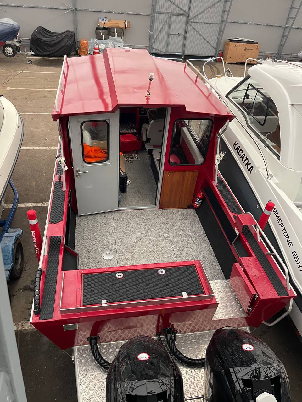Два лодочных мотора. Это обеспечивает высокую мощность и манёвренность, а также повышает надёжность лодки.